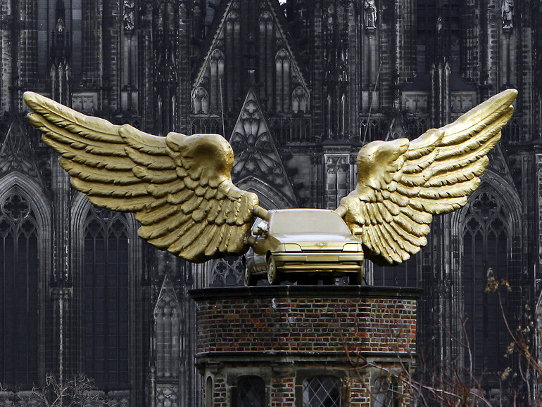 Goldener Vogel vorm Kölner Dom – Der Fiesta zählt zu den größten Erfolgen in der 100-jährigen Geschichte von Ford Deutschland. Seit 1991 flattert er als Kunstwerk über dem Kölner Stadtmuseum. Foto: Ford