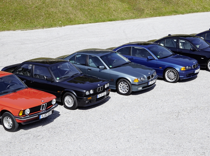 Die ersten sechs 3er- Generationen auf einen Blick – Von 1975 bis 2011 wuchs die BMW-Mittelklasse in den Abmessungen und im Leistungsvermögen. Foto: BMW AG