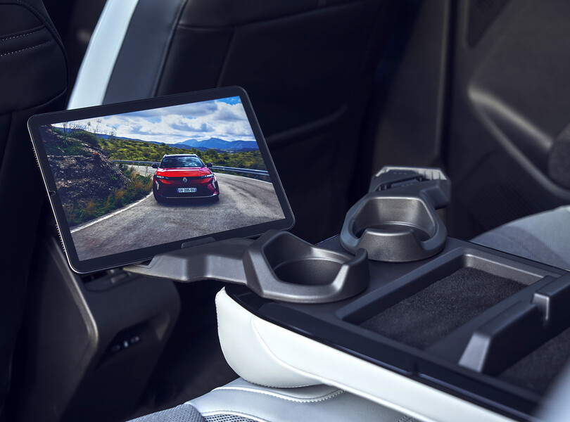 Als cleveres Extra gibt es immerhin eine Handyhalterung in der ausklappbaren Fond-Armlehne, so dass der Nachwuchs beim Tiktok-Gucken die Hände frei hat Foto: Renault