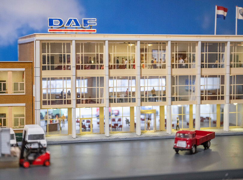 Ein Blickfang der besonderen Art ist derzeit im DAF-Museum in Eindhoven zu sehen: eine Miniatur-Nachbildung des historischen Firmenhauptgebäudes. Der Nachbau im beliebten Modelleisenbahnmaßstab 1:87 zeichnet sich durch seine besondere Liebe zum Detail aus. So kann der Betrachter zum Beispiel das Wandgemälde in der Eingangshalle ebenso entdecken wie den beeindruckenden Schreibtisch von DAF-Gründer Hub van Doome im ersten Stockwerk. Auch die übrigen Büroräume sind möbliert. Bevölkert ist das Innere von drei Zentimeter hohen, handbemalten Figuren.