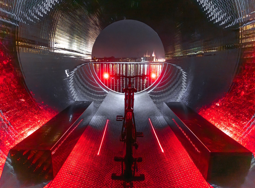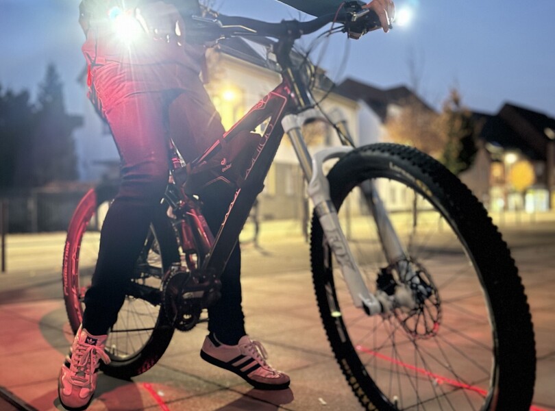 Ein Laserlicht strahlt nach unten und markiert dabei einen Schutzraum für den Radfahrer Foto: Bike Evolution