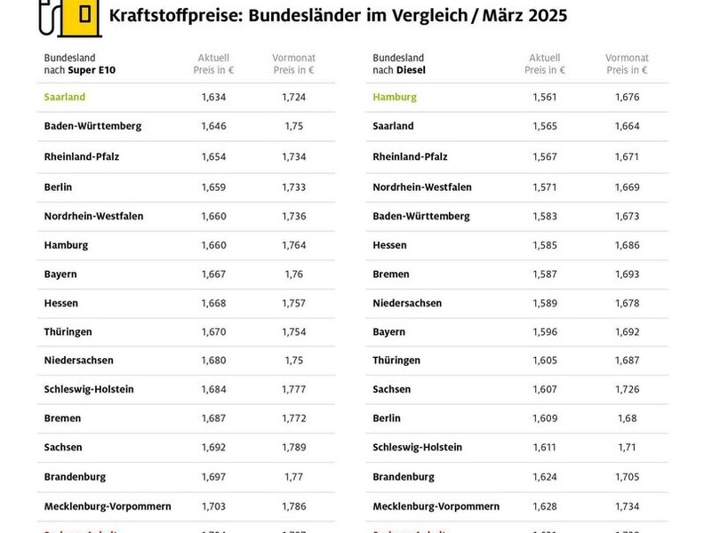 Nach wie vor sind die durchschnittlichen Kraftstoffpreise, die Kraftfahrer an der Tankstelle zu bezahlen haben, von Bundesland zu Bundesland unterschiedlich. Laut ADAC ist das Saarland aktuell bei Benzinpreis am günstigsten: Ein Liter Super E10 kostet dort im Mittel 1,634 Euro, gefolgt von Baden-Württemberg mit 1,646 Euro und Rheinland-Pfalz mit 1,654 Euro. Hamburg ist das günstigste Bundesland für Dieselfahrer: In der Hansestadt werden für den Liter im Schnitt 1,561 Euro fällig. Auf den Plätzen dahinter liegen das Saarland mit 1,565 Euro und Rheinland-Pfalz mit 1,567 Euro.