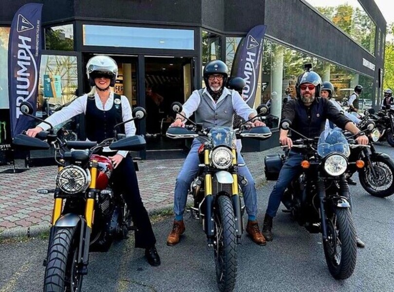 Beim Distinguished Gentlemans’s Ride dürfen natürlich auch Frauen mitfahren. Photo: Triumph via Autoren-Union Mobilität
