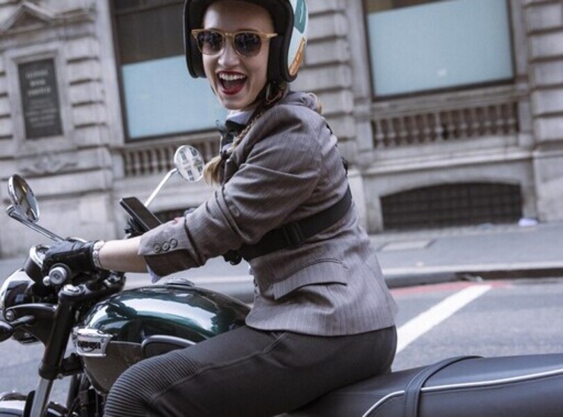 Beim Distinguished Gentlemans’s Ride dürfen natürlich auch Frauen mitfahren, wie hier TV-Moderatorin Grace Webb. Photo: Triumph via Autoren-Union Mobilität