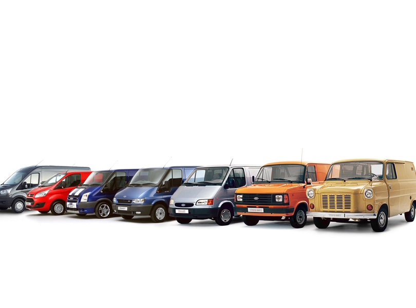 Sechs Generationen auf einen Blick – Der Transit befindet sich seit 1965 auf Wachstumskurs, im Format und im Absatzerfolg. Foto: Ford