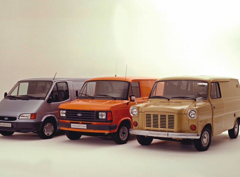 Drei Transit-Generationen – Dieselmotor für den Transit von 1972 (rechts), Plastikschick für den ab 1978 gebauten Transit (Mitte) und Aerodynamik für den dritten Transit (links). Foto: Ford