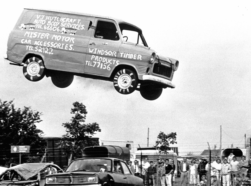 Weiter als alle anderen – Der Stuntman Steve Matthews erzielte 1985 einen Rekord, als er mit einem Transit über 15 Autos sprang. Foto: Ford