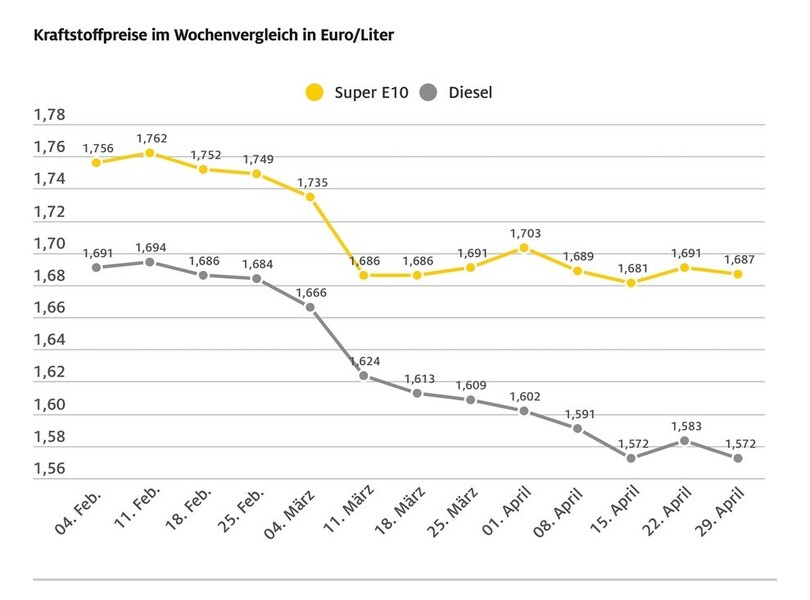 Die Entwicklung der Kraftstoffpreise in den vergangenen Wochen. Photo: ADAC via Autoren-Union Mobilität