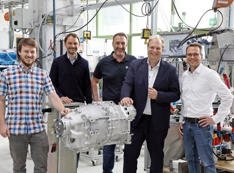 Produktionsjubiläum bei ZF: Dr. Jochen Witzig, Leiter des Produktionswerks Friedrichshafen (2.v.r.) mit dem Team aus der Markteinführung, Serienbetreuung und Produktion mit der 10.000sten Cetrax-Einheit. Photo: ZF via Autoren-Union Mobilität