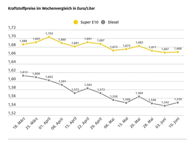 Die Entwicklung der Kraftstoffpreise in den vergangenen Wochen. Photo: ADAC via Autoren-Union Mobilität