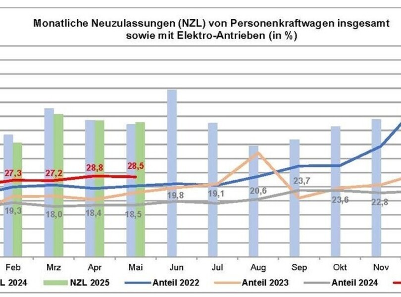 Insgesamt wurden in den ersten fünf Monaten diesen Jahres 646.421 Neuwagen mit alternativen Antrieben – Elektro (batterieelektrische Antriebe), Hybrid, Plug-in, Brennstoffzelle, Gas, Wasserstoff – zugelassen. Ihr Anteil am Gesamtneuzulassungsvolumen von 1.146.596 Personenkraftwagen (Pkw) betrug 56,4 Prozent. Die Anzahl alternativ angetriebener Neuwagen lag nach fünf Zulassungsmonaten im Jahr 2025 somit um 26,1 Prozent über dem Vergleichszeitraum des Vorjahres.
