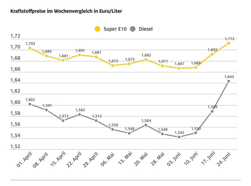 Die Entwicklung der Kraftstoffpreise in den vergangenen Wochen. Photo: ADAC via Autoren-Union Mobilität