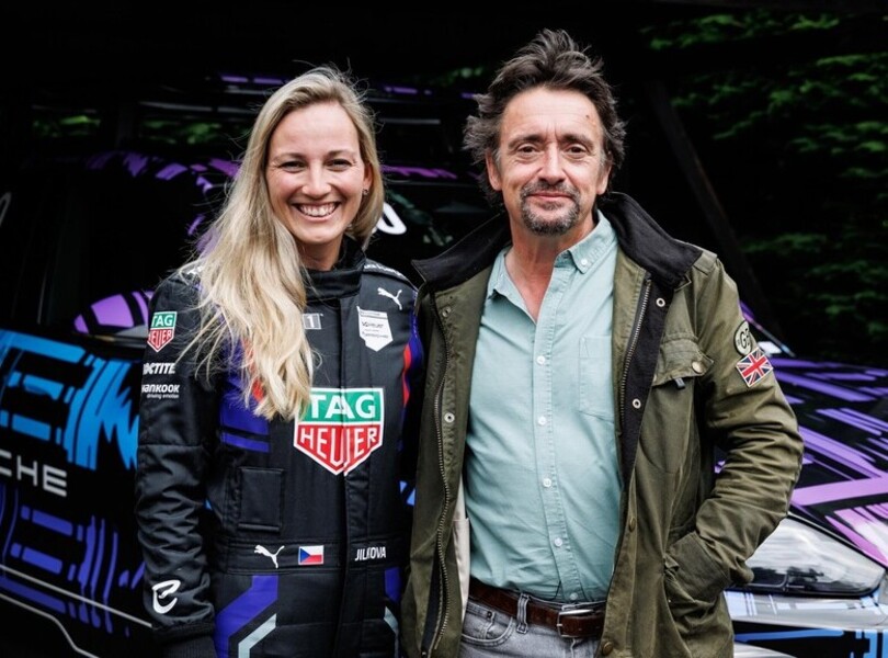 Formel-E-Entwicklungsfahrerin Gabriela Jílková und TV-Moderator Richard Hammond vor dem getarnten Prototyp des Porsche Cayenne Electric. Photo: Porsche via Autoren-Union Mobilität