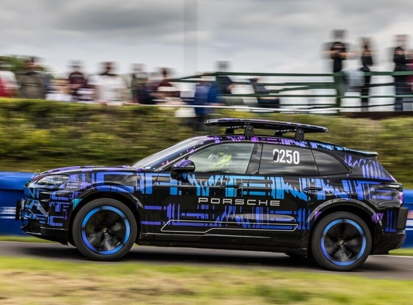 Ein getarnter Prototyp des Porsche Cayenne Electric stellte beim traditionellen Bergrennen von Shelsley Walsh in Großbritannien eine Bestzeit auf. Photo: Porsche via Autoren-Union Mobilität