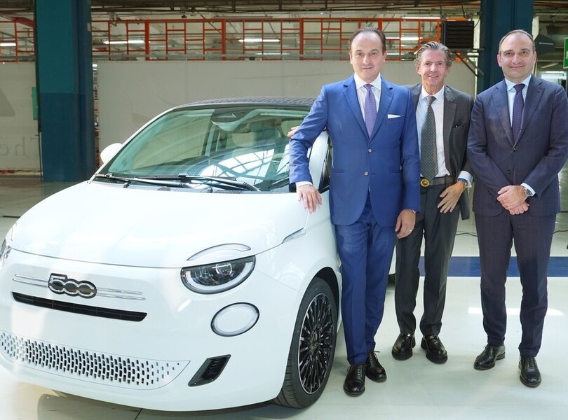 Feiern auf der Teststrecke des Werks Mirafiori die Rückkehr und Produktion des Fiat 500 mit Verbrennungsmotor in Italien: Markenchef Olivier Francois und Alberto Cirio, Präsident der Region Piedmont und Turins Bürgermeister Stefano Lo Russo. Photo: Stellantis via Autoren-Union Mobilität