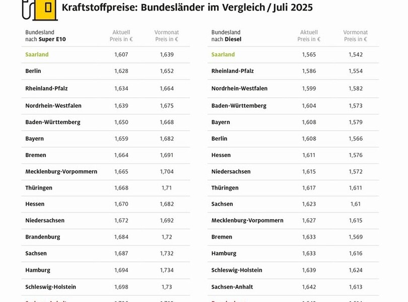 Wie schon im Juni ist das Saarland beim Tanken erneut das günstigste der 16 deutschen Bundesländer und dies mit deutlichem Abstand zu den jeweiligen Zweitplatzierten für Diesel und Super E10. Wie der ADAC meldet, ist Tanken aktuell in Sachsen-Anhalt und Brandenburg am teuersten. Dort kosten beide Kraftstoffsorten fast zehn Cent pro Liter mehr als im Saarland.