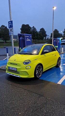 Ein Abarth 500e lädt an einem an einer Säule von Aral pulse. Photo: Autoren-Union Mobilität