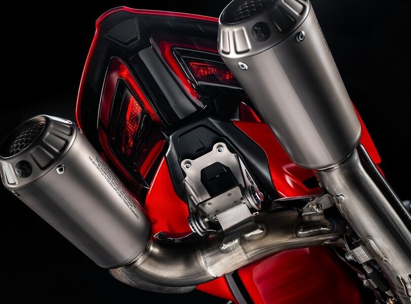 Ducati bietet ein Performance-Zubehörprogramm, mit dem die Panigale V2 und V4 für den Einsatz auf der Rennstrecke optimiert werden können. Für beide Modelle gibt es beispielsweise eine nicht für den Straßenverkehr zugelassene Titan-Auspuffanlage. Sie spart bei der V4 6,6 Kilo Gewicht ein und steigert die Leistung um 12 PS und bringt 7 Newtonmeter mehr Drehmoment, bei der V2 sind es 4,5 Kilogramm, 5,5 PS und 4,5 Nm.