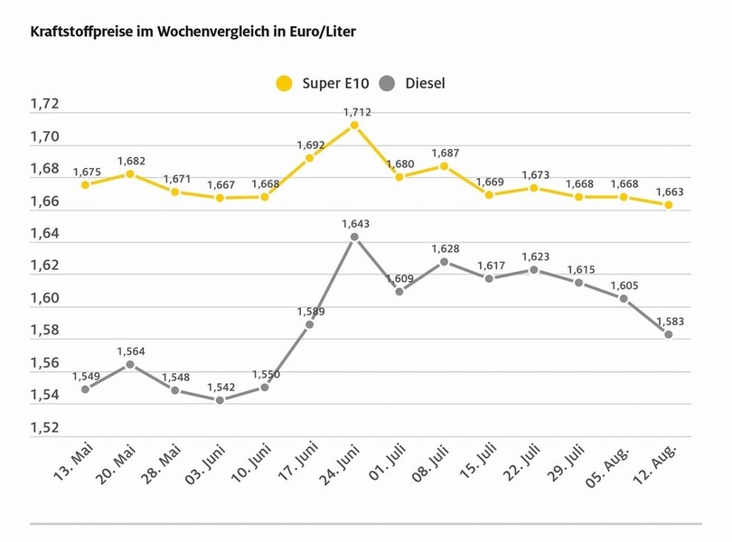 Der Dieselpreis ist im Wochenverlauf auf den niedrigsten Stand seit gut zwei Monaten gesunken, notiert aus Sicht des ADAC immer noch zu hoch. Ein Liter Diesel kostet derzeit im bundesweiten Mittel 1,583 Euro – das ist ein Minus von 2,2 Cent im Vergleich zur vergangenen Woche. Ein Liter Super E10 ist um 0,5 Cent billiger und kostet derzeit im Schnitt 1,663 Euro.
