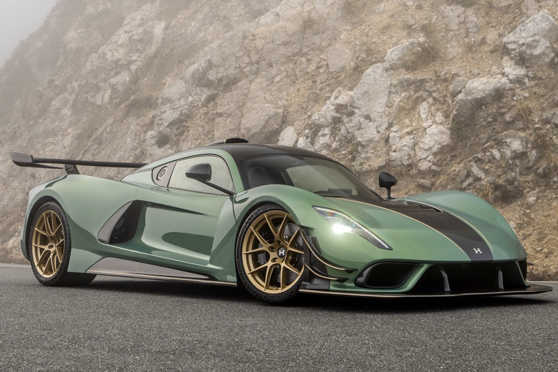 Hennessey, amerikanischer Tuner und Autohersteller, hat seinen 500-km/h-Flitzer Venom F5 in einer auf nur 3 Exemplare limitierten ,,Stealth Series" aufgelegt. Basis ist die f?r die Rennstrecke optimierte Variante Revolution, deren Aerodynamik-Styling 750 Kilogramm Abtrieb bei Tempo 400 erzeugt. Viele der daf?r n?tigen Anbauteile wurden in der Stealth Series aus Sichtcarbon gefertigt. Zudem erh?lt die 1.355 kW/1.842 PS starke V8-Flunder eine auf Kundenwunsch individuell angepasste Highend-Lackierung. Die Version ,,Elemental Green" kombiniert einen gr?nen Grundton mit diversen Akzenten in Mattgold. Allein der Lackierprozess soll bis zu 750 Mannstunden verschlingen.