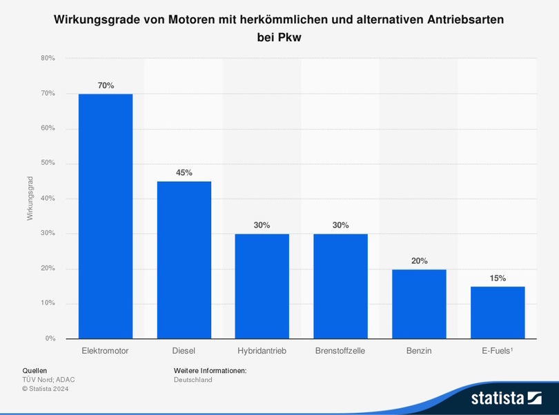 Das zeigt eine Grafik, die Statista auf Basis von Daten des TÜV Nord veröffentlicht hat: Elektromotoren erreichen demnach einen Wirkungsgrad von 70 Prozent und liegen damit weit vor effizienten Antriebsarten wie dem Dieselmotor (45 Prozent) oder dem Hybridfahrzeug (30 Prozent). Auch das potenziell klimafreundliche Brennstoffzellenauto, das in der Regel auf Elektroantriebe setzt, liegt mit einem Wirkungsgrad von 30 Prozent deutlich dahinter. Noch deutlich schlechter schneiden Benzinantriebe (20 Prozent) und mit E-Fuels betriebene Verbrennungsmotoren (15 Prozent) ab.